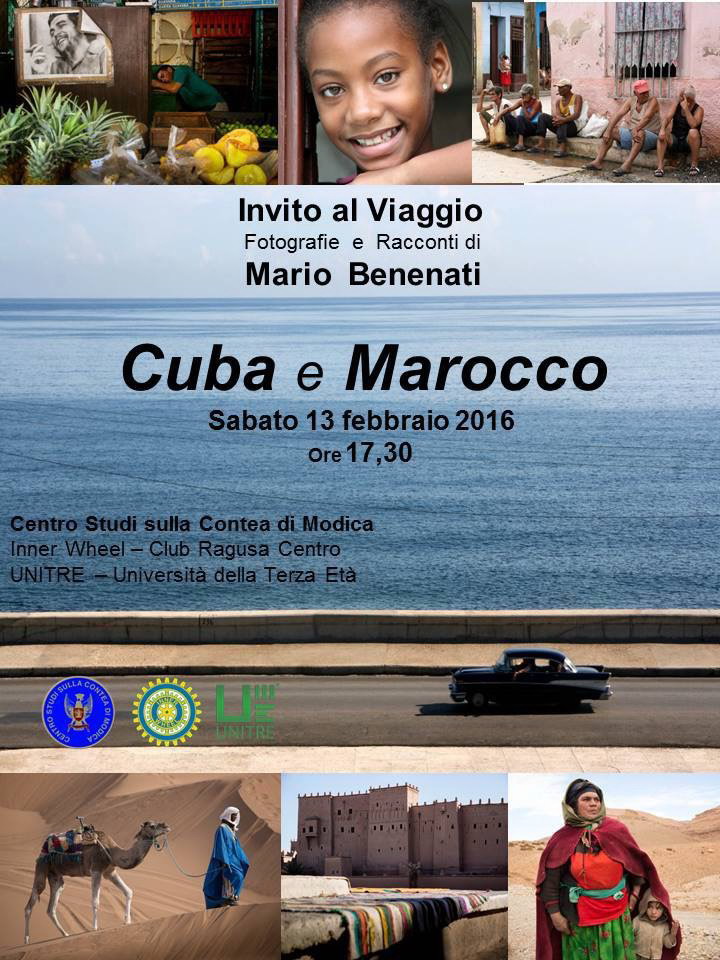 Mario Benenati ritorna questo sabato alle 17.30 a Palazzo De Leva a Modica per continuare il suo viaggio nelle Terre di Mezzo. E’ il secondo degli appuntamenti dei tre in calendario nel corso dei quali Mario Benenati con dovizia di foto, musica e testimonianze personali racconta la vita, i colori, l’arte, il cibo e gli odori di paesi lontani. Dopo il Ladakh, regione indiana al confine con l’Himalaya, Benenati racconterà il suo viaggio attraverso la Cuba di Fidel Castro, sempre dibattuta tra il sogno americano, e le bellezze del suo paesaggio e il Marocco, tra le città imperiali e il deserto. L’incontro è organizzato per iniziativa del Centro Studi sulla Contea di Modica insieme all’Inner Wheel Ragusa Centro e Unitre ed è aperto anche ai non soci.