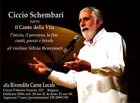 Il canto della vita, lo spettacolo del ragusano Ciccio Schembari che racconta cunti, poesie accompagnato dal violino di Silvia Benvenuti, alla Rivendita Carne Locale in Corso Vittorio Veneto, 327 Ragusa sabato 20 ore 21 e domenica 21 ore 18. Ingresso: 7 euro prenotazioni 339.2899.749.