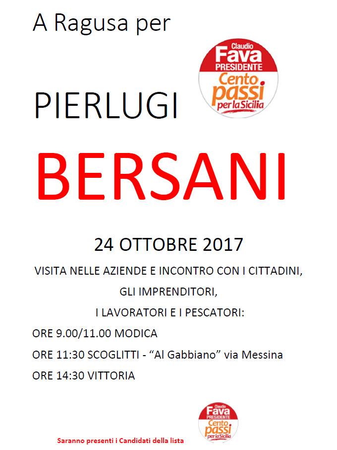 A sostegno della Lista Centro passi per la Sicilia – Claudio Fava Presidente, martedì 24 ottobre, l’esponente di Articolo 1 – Movimento Democratico progressisti sarà in visita presso alcune aziende, incontrerà cittadini, imprenditori, lavoratori, pescatori. Il programma prevede incontri a Modica tra le 9 e le 11, a Scoglitti alle 11:30 presso “Al Gabbiano” in Via Messina e a Vittoria alle 14:30. Saranno presenti i quattro candidati iblei nella Lista Cento passi per la Sicilia – Claudio Fava Presidente, Francesco Aiello, Giovanni Distefano, Resi Iurato e Salvatore Poidomani.