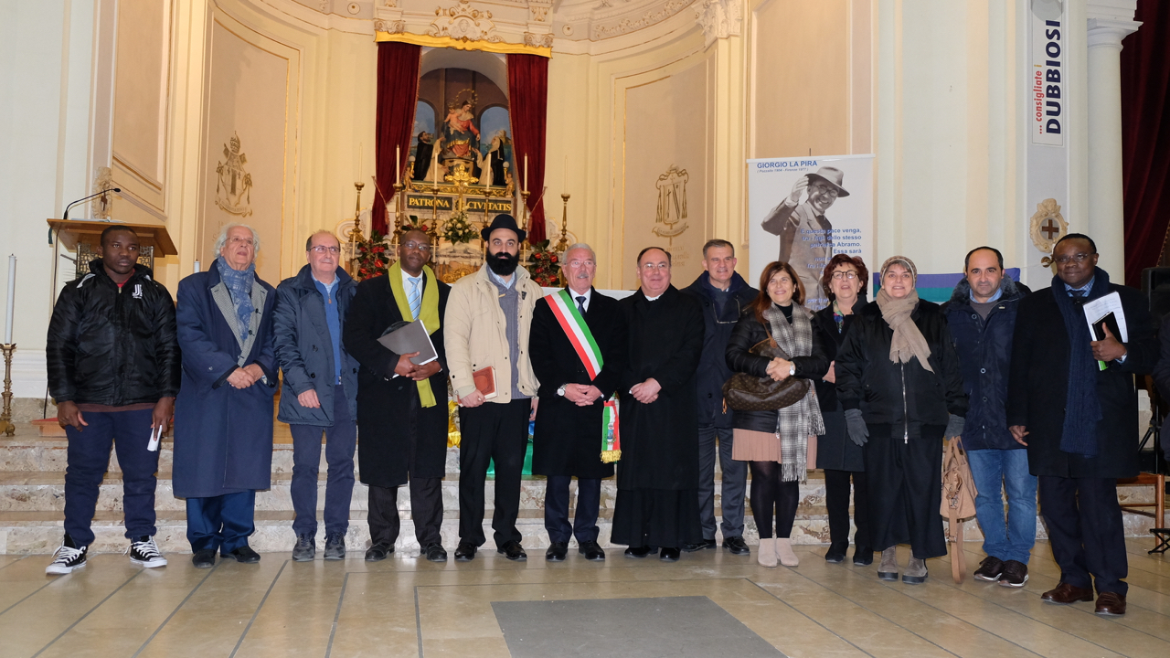 Cristiani, ebrei, musulmani insieme per la pace, nella terra di Giorgio La Pira, in occasione dell’anniversario della nascita. “Santa è la pace, non la guerra”. Le parole di papa Francesco sono risuonate con forza all’inizio della veglia che si è tenuta ieri sera nella chiesa madre al termine della marcia iniziata davanti alla chiesa di Santa Maria di Portosalvo. Piena sintonia tra il messaggio del papa, che chiede di fare della nonviolenza uno stile di vita e anche della politica, e la testimonianza del ‘sindaco santo’. C’è un solo Dio, e tutte le strade portano a Lui. Lo ha ricordato l’Imam Thierno Barry, rifugiato della Nuova Guinea. L’Imam ha parlato di uno stile di umanità che apprende la saggezza di Dio attraverso i genitori o quanti sanno essere da esempio. Il vice rabbino di Siracusa, Gabriele Spagna, ha ricordato La Pira e la comune radice abramitica delle tre grandi religioni monoteistiche, che genera fraternità e dialogo. E la radice abramitica si è concretizzata nel saluto portato a nome del rabbino in ritiro a Gerusalemme: ritrovare la pace, anzitutto dentro noi stessi. Il presbitero cattolico, don Paolo Catinello, ha portato nella preghiera tutte le situazioni di guerra e in particolare la sofferenza dei bambini. La comunità missionaria ha introdotto un testo di un poeta giapponese in uno degli intermezzi musicali curati da Pier Paolo Sichera. Suor Giovanna, che per tanti anni è stata in Oriente, ha riportato una bella preghiera indù.