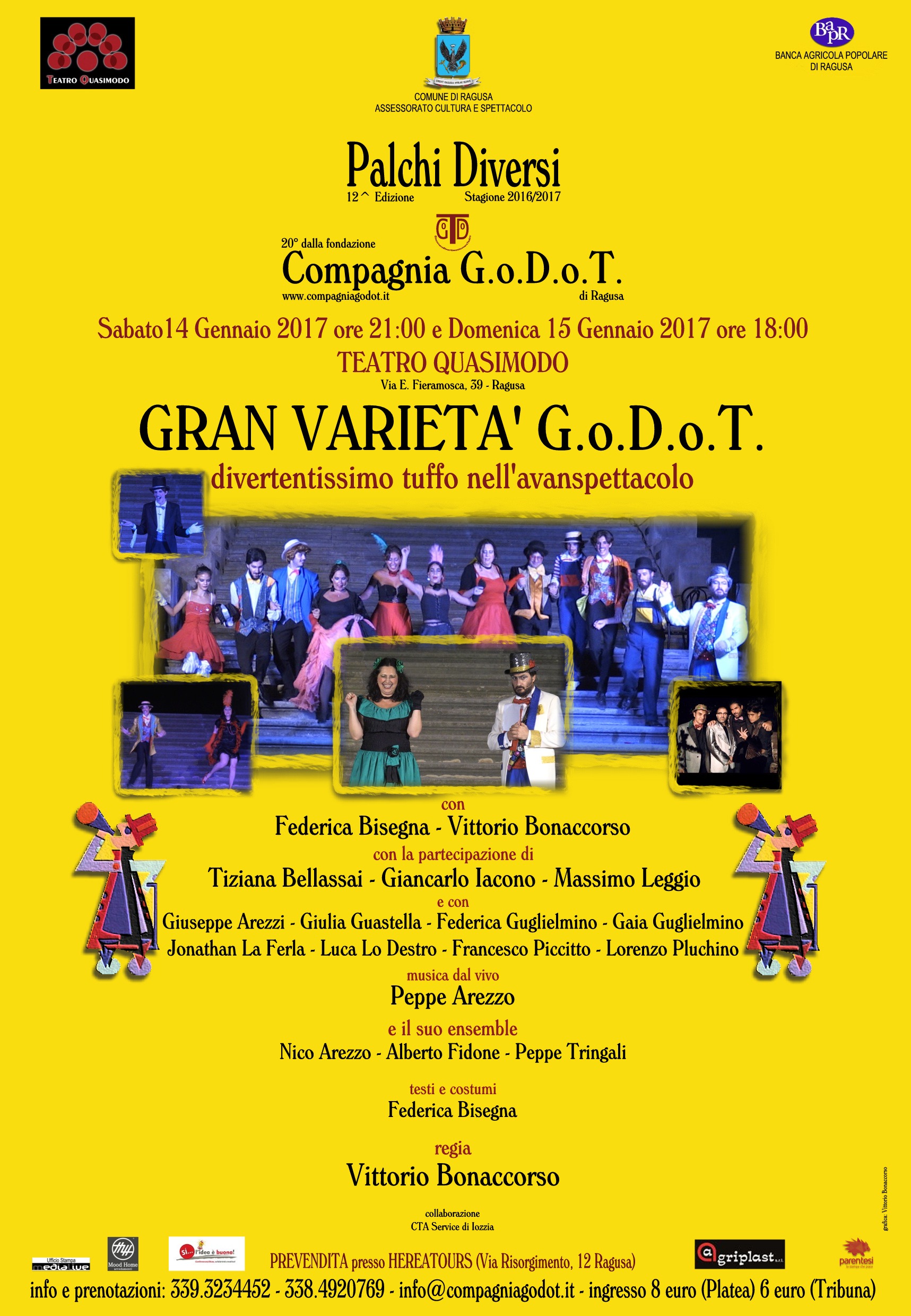 Sabato 14 Gennaio alle ore 21:00 e Domenica 15 Gennaio alle ore 18:00 al Teatro Quasimodo, per la 1° Stagione Comunale di Ragusa, la Compagnia G.o.D.o.T. ritorna con uno spettacolo che ha riscosso tanto successo in estate: si tratta di “GRAN VARIETA’ G.o.D.o.T.” un divertentissimo tuffo nell’avanspettacolo, con Federica Bisegna, Vittorio Bonaccorso, Tiziana Bellassai, Giancarlo Iacono, Massimo Leggio, gli attori della Compagnia G.o.D.o.T. e con la musica dal vivo del Maestro Peppe Arezzo e il suo ensemble, regia di Vittorio Bonaccorso. Ingresso 8 euro. Per info: 339.3234452 – 338.4920769 – [email protected] – www.compagniagodot.it.