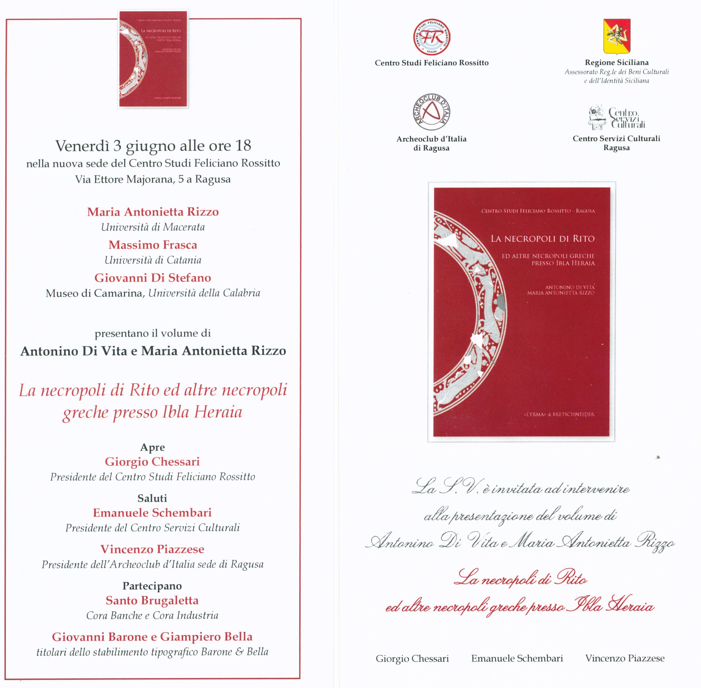 Venerdì 3 giugno, alle ore 18.00 presso i nuovi locali del Centro Studi “F. Rossitto” (Via E. Majorana, 5 – Ragusa), i professori Maria Antonietta Rizzo (Università di Macerata), Massimo Frasca (Università di Catania), Giovanni Di Stefano (Museo di Camarina, Università della Calabria) presenteranno il volume di Antonino Di Vita e Maria Antonietta Rizzo “La necropoli di Rito ed altre necropoli greche presso Ibla Heraia”. Aprirà i lavori Giorgio Chessari.