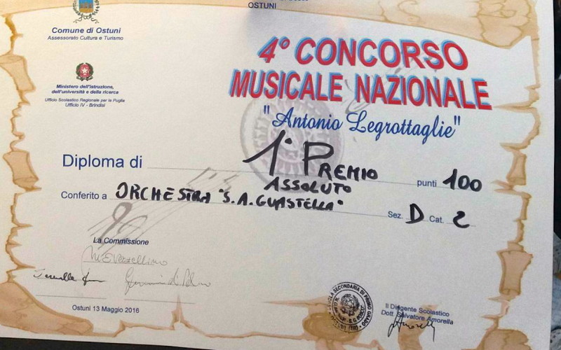 L’Orchestra dell’Istituto comprensivo “S. A. Guastella” di Chiaramonte Gulfi si è aggiudicata il primo premio assoluto al concorso musicale nazionale “A. Legrottaglie” svoltosi a Ostuni (Brindisi) raggiungendo la votazione di 100/100. L’orchestra si è dovuta confrontare con altre 32 orchestra provenienti da tutta Italia. I ragazzi sono stati preparati dagli insegnanti Mariapaola Marletta (percussioni), Vincenzo Monaca, (tromba), Mario Pollicita, (pianoforte) e Ivano Tornello, (chitarra). L’orchestra ha eseguito brani particolari, arrangiati e diretti dal professore Vincenzo Monaca, nello specifico: Tango pour Claude di R. Galliano, Nuovo Cinema Paradiso di E. Morricone e Rhapsody in Blue di G. Gershwin. Alcuni allievi hanno partecipato al concorso sia come solisti o in formazione cameristica, raggiungendo sempre la prima posizione. Bravissimi il trio di trombe “Holiday” formato da Seby Battaglia, Luca Gravina e Nobile Erika, e la chitarrista Beatrice Barresi, in qualità di solista. Grande soddisfazione è stata espressa dal dirigente scolastico prof. Giovanni Giaquinta e da tutto il corpo docenti.