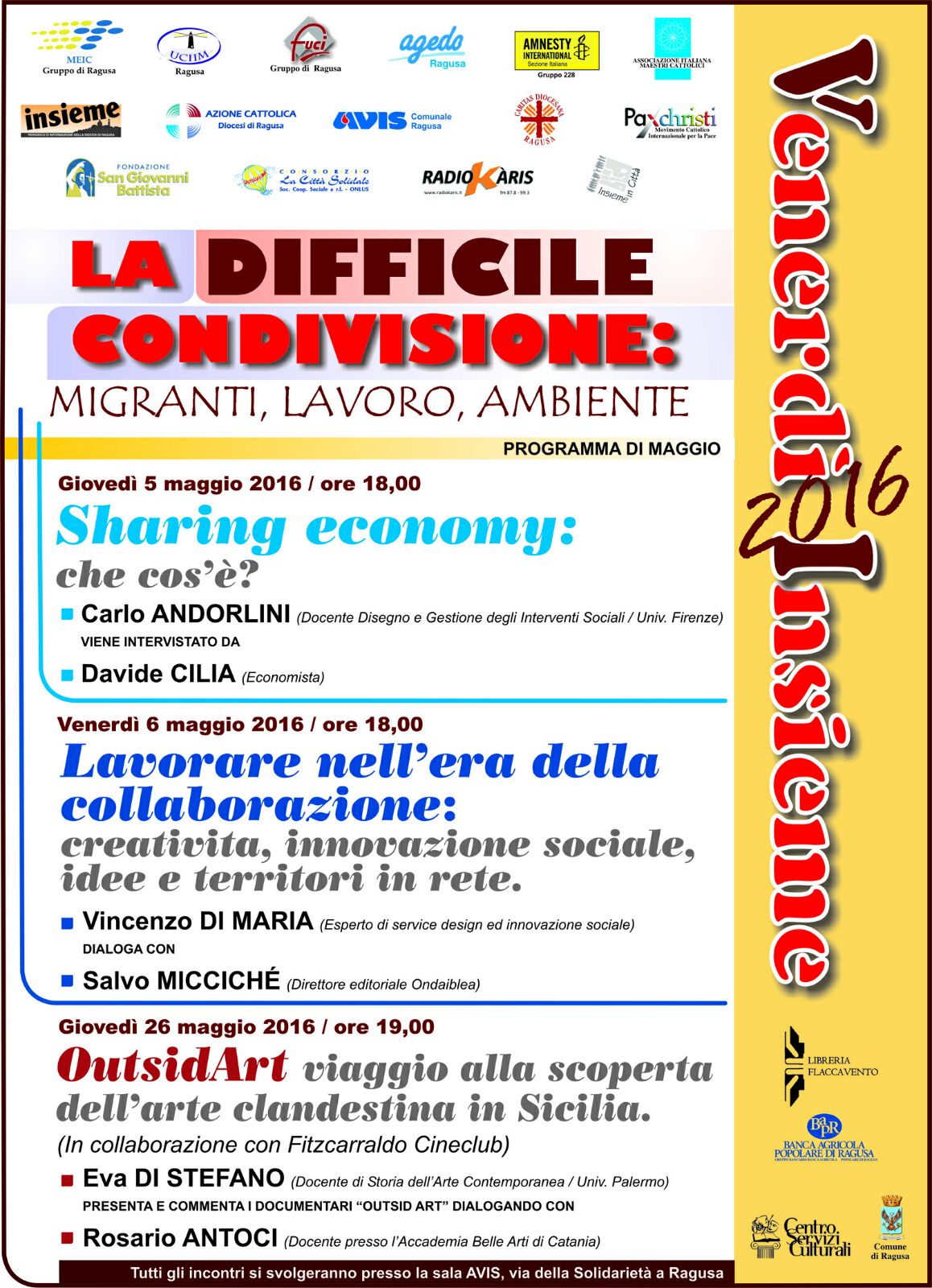 Prosegue il ciclo di incontri di cittadinanza attiva sul tema “La difficile condivisione: migranti, lavoro, ambiente”, che avranno luogo presso la sala “Saro Di Grandi” dell’Avis di Ragusa. Il prossimo appuntamento si svolgerà giovedì 5 maggio, alle ore 18:00, e verterà sul concetto della Sharing economy. A tal proposito l’economista Davide Cilia intervisterà Carlo Andorlini, docente di Disegno e Gestione degli Interventi Sociali presso l’Università di Firenze. La rassegna “Venerdì Insieme 2016” continuerà venerdì 6 maggio, alle ore 18:00, con la conferenza “Lavorare nell’era della collaborazione: creatività, innovazione sociale, idee e territori in rete”; interverranno in merito Vincenzo Di Maria, esperto di service design ed innovazione sociale, e Salvo Miccichè, Direttore editoriale di Ondalibera.
