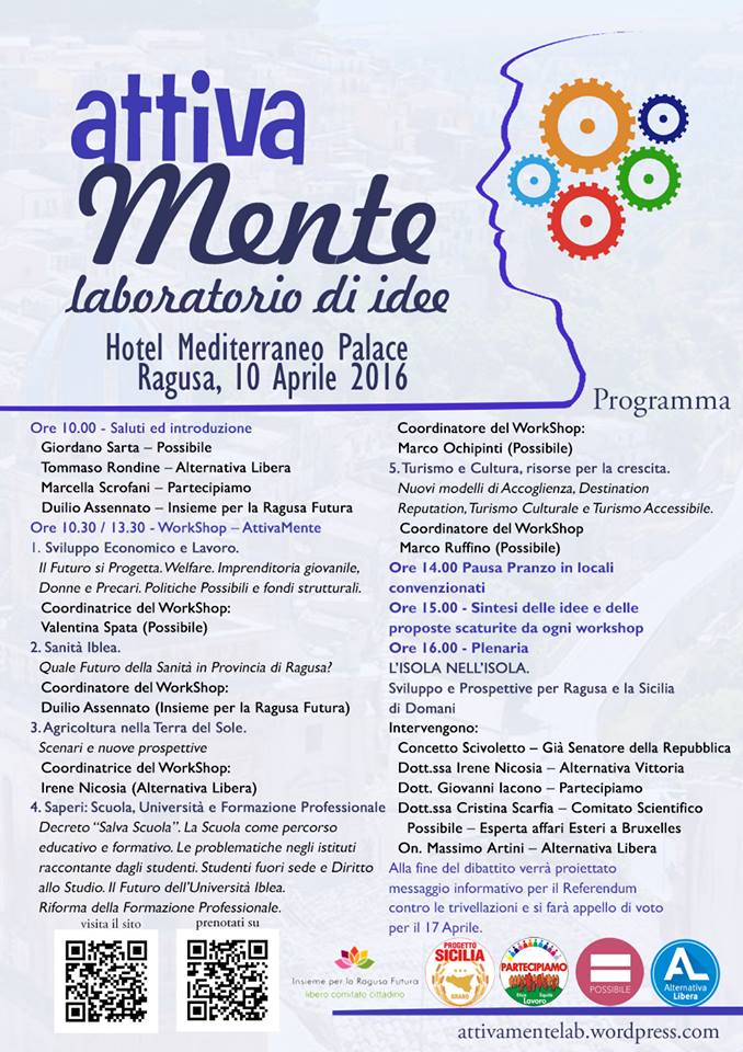 Domenica 10 aprile alle ore 10.00, presso la sala dell’Hotel Mediterraneo Palace di Ragusa, si terrà l’evento “Attivamente – Laboratorio di idee” organizzato da Possibile, Partecipiamo, il comitato cittadino “Ragusa Futura”, Alternativa Libera e Progetto Sicilia. L’ iniziativa consiste in un laboratorio politico che ha come finalità la creazione di sinergie tra attori locali, l’aggregazione di idee, competenze ed esperienze che possano approdare alla formulazione di proposte concrete per il territorio. L’evento è aperto a tutti coloro i quali vorranno condividere le proprie idee e progetti o più semplicemente ascoltare punti di vista differenti su determinate tematiche, previa registrazione sul sito www.attivamentelab.wordpress.com. Più nello specifico, il programma della giornata inizierà alle ore 10:00 con la registrazione dei partecipanti e proseguirà con una presentazione comune dell’iniziativa. Seguirà l’avvio di 5 workshop, ognuno dei quali procederà autonomamente rispetto agli altri, su 5 grandi tematiche: Lavoro e Sviluppo Economico coordinato da Valentina Spata; Turismo e Cultura coordinato da Marco Ruffino; Sanità coordinato dal Dott. Duilio Assennato; Ambiente ed Agricoltura coordinato da Irene Nicosia; Scuola, Università e Formazione Professionale coordinato da Marco Occhipinti. Dopo una pausa pranzo e la sintesi dei lavori dei workshop, alle ore 16:00 è prevista una plenaria finale che affronterà delle tematiche concernenti la Provincia di Ragusa ed il futuro della Sicilia. Tra gli ospiti saranno presenti l’On. Massimo Artini di Alternativa Libera, il movimento politico alleato di Possibile in Parlamento; Cristina Scarfia del Comitato Scientifico nazionale di Possibile, nonché esperta di Affari Europei a Bruxelles; Sasha Vinci, un artista sciclitano le cui opere sono state presentate in diverse mostre nazionali ed internazionali; numerose personalità della Provincia di Ragusa, tra cui Giovanni Iacono di Partecipiamo, Concetto Scivoletto, già Senatore della Repubblica; Irene Nicosia di Alternativa Libera candidata a Sindaco a Vittoria; Cesare Borrometi, Presidente del Consorzio Universitario Ibleo; Salvatore Martorana di Partecipiamo, già assessore Politiche Sociali a Ragusa; Raffaele Rizzone, già Sindaco di Ragusa che affronterà il tema della Formazione Professionale in Sicilia.