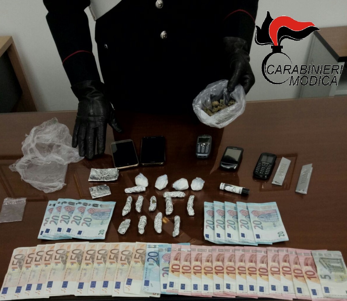 I Carabinieri hanno arrestato cinque persone, G.M., classe ‘98, S.A., classe 1985, una ragazza S.M., classe ’90, già noti alle forze di polizia, S.F., classe 1996, incensurato, ed un minorenne, tutti pozzallesi, trovati in possesso di diverse dosi di cocaina e marijuana, soldi in contanti e banconote false. I cinque soggetti sono stati pedinati dai Carabinieri mentre percorrevano la strada Rosolini-Pozzallo a bordo di un’autovettura e, dopo un breve inseguimento, i militari hanno bloccato l’autovettura. Gli uomini dell’Arma hanno rinvenuto, a bordo del veicolo ed in parte addosso ai giovani, diversi involucri contenenti varie dosi di cocaina, per un peso complessivo di 20 grammi, altre dosi di marijuana, per un peso di 25 grammi circa, vario materiale per il confezionamento della sostanza, la somma in contanti di 775 euro, verosimilmente provento dell’attività di spaccio, e numerose banconote false da 20 euro, tutte riportanti lo stesso numero di serie. I tre uomini maggiorenni sono stati tradotti presso la Casa Circondariale di Siracusa, la donna presso la Casa Circondariale di Catania ed il minore presso il centro di prima accoglienza per minori di Catania.