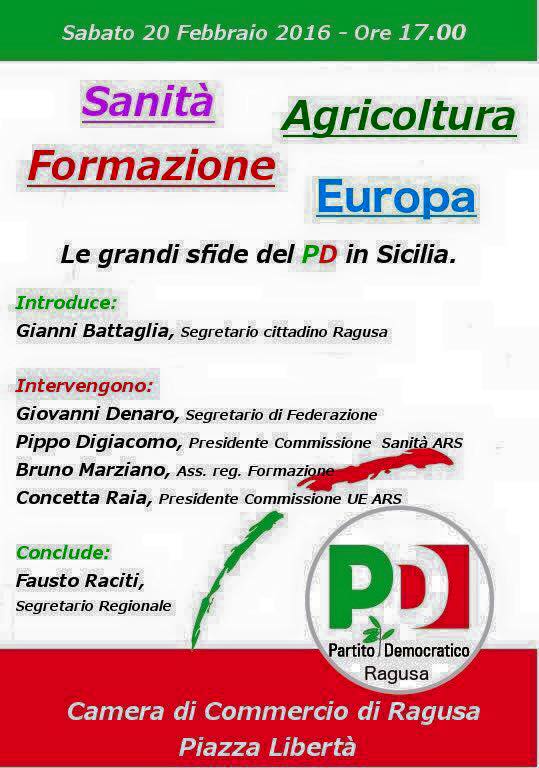 Organizzato per questo sabato alle ore 17:00, presso la Camera di Commercio di Ragusa in piazza Libertà, un incontro sui seguenti temi: Sanità, Agricoltura, Formazione, Europa. Interverranno: Gianni Battaglia, Segretario Cittadino Pd Ragusa, Giovanni Denaro, Segretario Provinciale Pd, Pippo Digiacomo, Presidente VI Commissione Servizi Sociali e Sanitari Ars, Bruno Marziano, Assessore alla Formazione Regione Sicilia, Concetta Raia, Presidente Commissione Unione Europea Ars, Fausto Raciti, Segretario Regionale del partito.