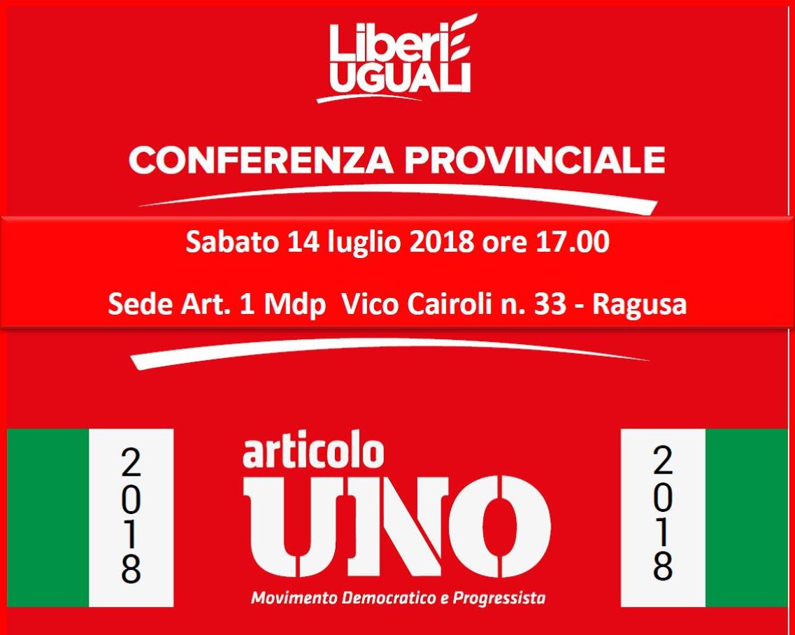 Convocata anche a Ragusa la Conferenza provinciale politico organizzativa per rilanciare una nuova sinistra che si terrà sabato 14 luglio presso la sede provinciale di Art. 1 Mdp, vico Cairoli 33. Il programma della giornata prevede alle ore 17.00 l’insediamento della Presidenza e gli adempimenti regolamentari; seguirà la relazione del coordinatore uscente, sen. Gianni Battaglia, e il dibattito. Quindi si procederà alla elezione del coordinatore provinciale, del coordinamento provinciale, alla votazione del documento politico nazionale e di eventuali emendamenti, alla designazione dei delegati all’assemblea regionale del 20 luglio e dei delegati all’assemblea nazionale del 22 luglio.