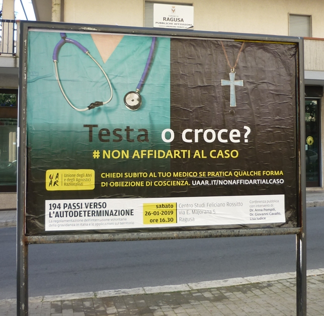 È l’obiezione di coscienza dei medici, in particolare ginecologi ma non solo, l’argomento della nuova campagna di sensibilizzazione dell’Uaar. Proprio in questi giorni sono partite le affissioni dei manifesti anche a Ragusa e contemporaneamente è iniziata la distribuzione di volantini esplicativi. «Ci rivolgiamo agli utenti – spiega Massimo Maiurana, coordinatore del circolo di Ragusa dell’Uaar – facendo loro una domanda molto semplice: sapete se il vostro medico è un obiettore? È importante esserne a conoscenza subito, informarsi e poi valutare se è il caso di rivolgersi a qualcun altro, perché saperlo nel momento in cui ci occorrerà la sua assistenza sarà probabilmente troppo tardi. Equivale a tirare una monetina e vedere se esce “testa o croce”, che è appunto il titolo della campagna». La Sicilia è ai primi posti per la percentuale di ginecologi obiettori, l’86% dei ginecologi, il 78,9% degli anestesisti e l’84,5% del personale non medico. Un problema per gli ospedali, che per erogare il servizio di interruzione di gravidanza devono spesso ricorrere a personale esterno, un problema per i non obiettori che di fatto sono costretti a non poter quasi fare altro, un problema per le donne che vogliono interrompere una gravidanza indesiderata o problematica, ma devono a volte spostarsi di decine o centinaia di chilometri per poterlo fare. Ma l’obiezione di coscienza non è solo quella istituita con la legge 194; ci si può imbattere in medici che si astengono dal dare seguito alle volontà del paziente nella fase terminale della sua vita, e la stessa legge 219/17 che ha riconosciuto le Disposizioni Anticipate di Trattamento non ha posto alcun obbligo in capo al personale sanitario. L’iniziativa dell’Uaar sarà completata da un incontro pubblico dal titolo “194 passi verso l’autodeterminazione”, che si svolgerà sabato 26 gennaio alle 16.30 al Centro Studi Feliciano Rossitto. A fare il punto sulla situazione per quanto riguarda l’obiezione di coscienza sulle interruzioni di gravidanza saranno la dott.ssa Anna Pompili di Roma, il dott. Giovanni Cavallo di Modica e Lisa Iudice della Casa delle Donne di Ragusa. Spiega Clara Corallo, vice coordinatrice del circolo e presentatrice nell’incontro: «con i nostri tre ospiti parleremo della legge, dei suoi punti di forza e delle sue storture, delle sue applicazioni in Italia nel mondo e nel territorio del ragusano, nonché delle esperienze di chi sui binari di essa lavora ogni giorno come medico e come attivista».