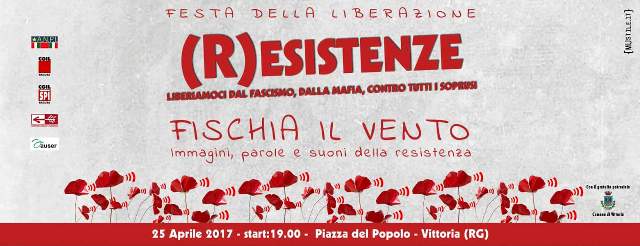 “Resistenze contro il Fascismo, Mafia e Sfruttamento” è il tema con il quale sarà celebrato il 25 aprile 2017 in occasione del 72° anniversario della Liberazione d’Italia. La Cgil, l’Anpi, lo Spi Cgil, l’Auser e l’Unione degli Studenti organizzano una serata di musica, video e mostre in Piazza del Popolo a Vittoria per le ore 19.00 di martedì 25 aprile. L’iniziativa intende promuovere, in un’ottica di intergenerazionalità, i valori della Resistenza antifascista attraverso l’intreccio di diversi linguaggi artistici che ripercorrono i temi della storia e dell’attualità. Nel corso della serata saranno proiettate immagini tratti dal documentario Accaniti di Enzo Rizzo sulla storia di Vittoria e l’esposizione di schede biografiche su alcuni dei tanti Antifascisti Vittoriesi tratti dall’opera di Gianni Ferraro Vittoria Antifascista con l’elaborazione grafica curata da Sergio Mustile. Lo Spettacolo Musicale dal titolo “Fischia il vento, Immagini, parole e suoni della Resistenza” vedrà sul palco musicisti come Giacomo Aurnia, Saretto Emmolo, Rosario Arancio Febo, Valerio Macca, Rocco Mammano, Nadia Marino, Antonio Modica, Giampiero Scifo e i Demetra.