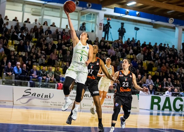 E’ il Venezia a imporsi in casa nella prima delle 5 gare contro la Passalacqua Ragusa. Il punteggio finale è stato di 73 a 69 e giovedì 18 alle ore 20 ci sarà gara due, sempre in Veneto. Miglior realizzatrice per le biancoverdi è stata Nicole Romeo con 17 punti, Sabrina Cinili ha realizzato 13 punti, Jessica Kuster 12, Chiara Consolini 10, Dearica Hamby 6, Jillian Harmon 6, Alessandra Formica 5.
