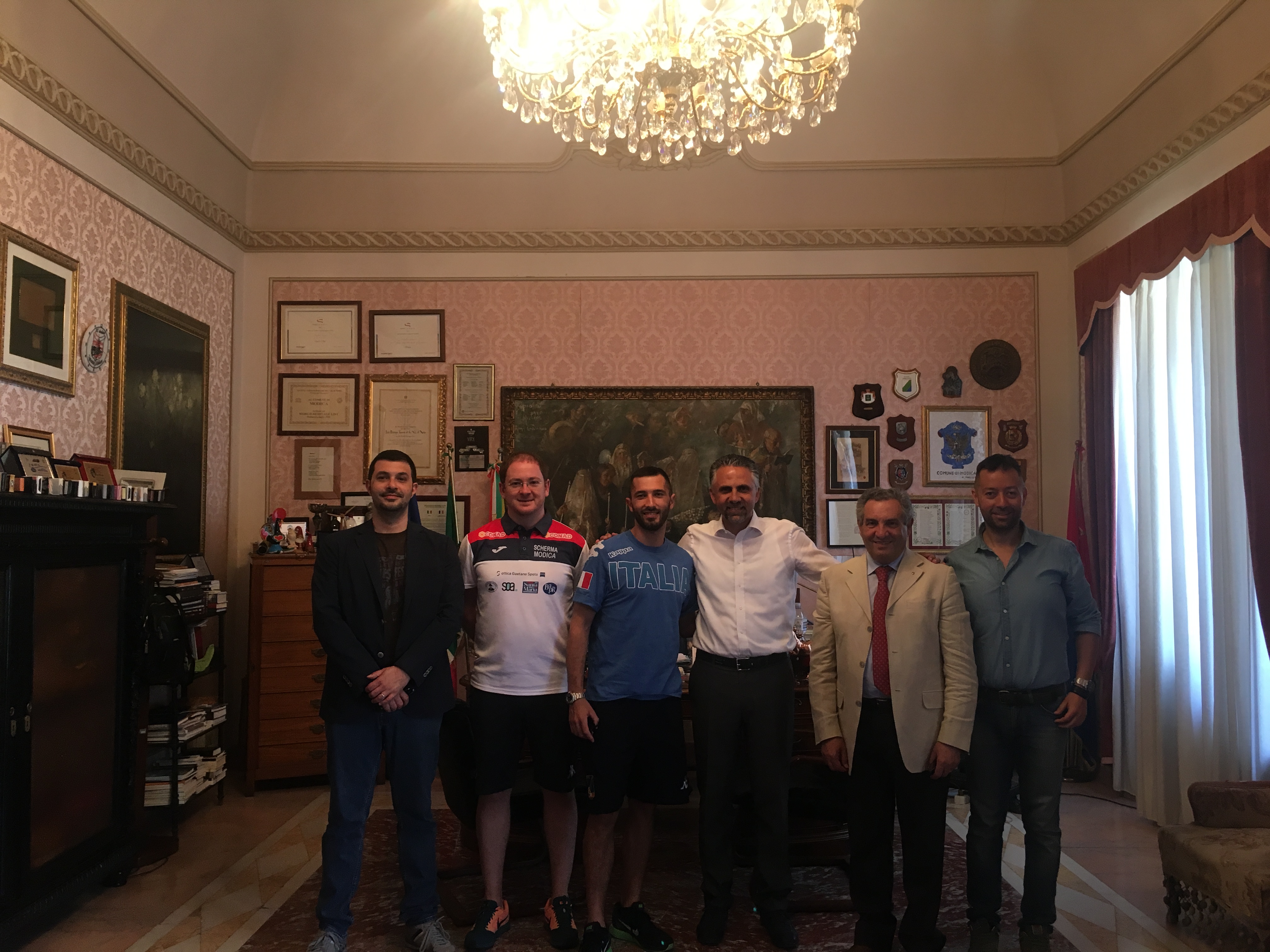Una mattinata a cinque cerchi quella vissuta giovedì al Comune di Modica grazie alla visita dei modicani che prenderanno parte, a vario titolo, alle prossime Olimpiadi di Rio. Il Presidente della Federazione Italiana Scherma, Giorgio Scarso, l’azzurro di fioretto Giorgio Avola, il Maestro della squadra di fioretto, Eugenio Migliore ed responsabile marketing e social media Alessandro Noto. Sei figli di Modica che porteranno oltre oceano il nome della Contea per difendere i colori italiani. “Un grande orgoglio per tutta la città – dichiara il Sindaco Abbate – perché non ci sono altri Comuni delle stesse dimensioni di Modica in Italia che possono vantare un numero così elevato di “olimpionici”. La Scherma ha da sempre regalato grandi emozioni a Modica, come dimenticare l’oro olimpico di Avola quattro anni fa a Londra? Per scaramanzia non diciamo niente ma ci faremo trovare pronti ad ogni eventualità il 7 e il 12 agosto (prova individuale e a squadre di fioretto maschile)”. “Tornare a Modica è sempre un piacere – dice Giorgio Avola – perché ritrovo la mia famiglia, la mia città, il mio mare. Purtroppo per quest’ultimo ho pochissimo tempo perché non posso sospendere gli allenamenti neanche per un giorno. Sono pienamente concentrato sull’obiettivo. Sentirò il tifo dei miei concittadini anche a migliaia di km di distanza”. Così il presidente Scarso: “La Scherma è sempre molto attesa alle Olimpiadi perché è la disciplina che ha regalato più medaglie all’Italia nella storia”.