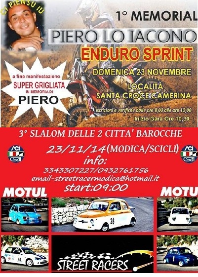 Domenica mattina la provincia iblea si è svegliata con il rombo dei motori di auto e moto scesi in strada rispettivamente per le competizioni di slalom in salita e di prove di enduro. A rilevare i tempi e stilare le classifiche, con l’ausilio di master, tabelloni grafici, semafori, fotocellule e computer, sono stati i cronometristi dell’Asd “Hyblea” di Ragusa che hanno saputo ben gestire le varie postazioni con grande professionalità. A Scicli, lungo i tornanti di contrada Spana, si è corso lo “Slalom delle 2 Città Barocche” giunto alla terza edizione ed organizzata dall’ Asd “Street Racers” di Modica. La gara, articolata in due maches cronometrate, ha visto i circa 70 partecipanti fare i conti con la velocità e le postazioni di rallentamento. Ad imporsi nella categoria assoluti sono stati gli etnei della scuderia Catania corse a bordo delle rispettive Formula Gloria: Agostino Bonforte di Catania, ha vinto la gara con il tempo di 1’50’’58, mentre il suo compagno di scuderia, Davide Miraglia di Belpasso ha bloccato i cronometri a 1’54”13; l’ultimo gradino del podio è stato occupato dal messinese Salvatore Bellini su Radical Prosport portacolori della SGB Rallye di Messina che ha realizzato il tempo di 1’55”83. Nella classifica ADB (Attività Di Base) ad imporsi su tutti è stato Francesco Minardo su A 112 Abarth della scuderia Street Racers di Modica, che ha fatto registrare il tempo di 2’11”05 precedendo di 1”23 Giovanni Avveduto su Fiat 500, al terzo posto si è piazzato Giuliano Frasca su Peugeout 205 con il tempo di 2’12”94. Gli sterrati di Santa Croce Camerina, invece, hanno accolto il primo Memorial di enduro “Pietro Lo Iacono”. La gara, disputata con la formula dell’Enduro Sprint, è stata organizzata dal Moto Club Hobby Motor di Ragusa. Il tacciato ha previsto un Cross test di km 3 da ripetere 6 volte. Ancora una volta ad avere la meglio su tutti, sono stati i piloti a bordo delle Ktm, che hanno conquistato i più alti gradini del podio. Nella classifica assoluti ad aggiudicarsi la gara è stato Andrea Giglio della scuderia Hobby Motor di Ragusa, che ha bloccato i cronometri a 23’54”10, al secondo posto, con un ritardo di 29”88, si è piazzato il suo compagno di scuderia, Marco Antoci, mentre l’ultimo gradino del podio è andato ad Ermes Conti della scuderia Ifa Trinacria Off Road di Vittoria con il tempo di 24’41”05.