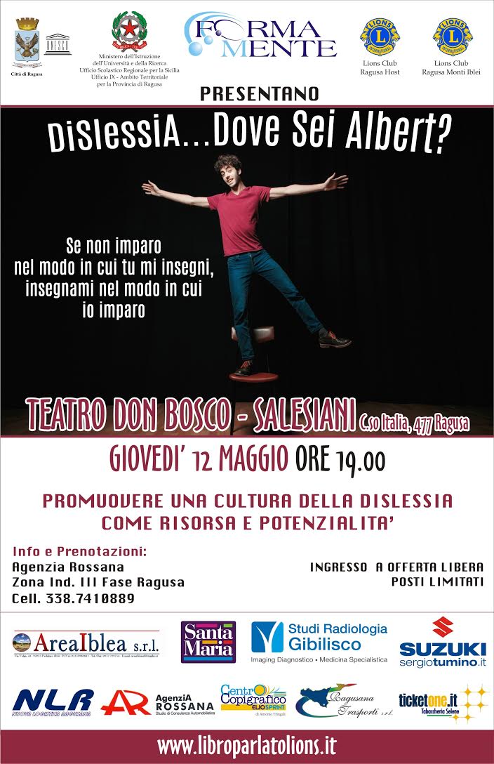 Club Lions Ragusa Host e Monti Iblei organizzano il monologo teatrale sui DSA (Disturbi Specifici dell’Apprendimento) scritto e interpretato dall’attore Francesco Riva. “DiSlessia…Dove sei Albert?” narra l’affascinante vicenda di Giacomo, un bambino incompreso dalla scuola e dai genitori solo perché non “apprende” come i suoi compagni. Con brillante ironia, Francesco riesce a far riflettere sulla dislessia che è ancora poco conosciuta sia nella scuola che nella società. Per Info cell. 338 7410889. Giovedì 12 maggio ore 19.