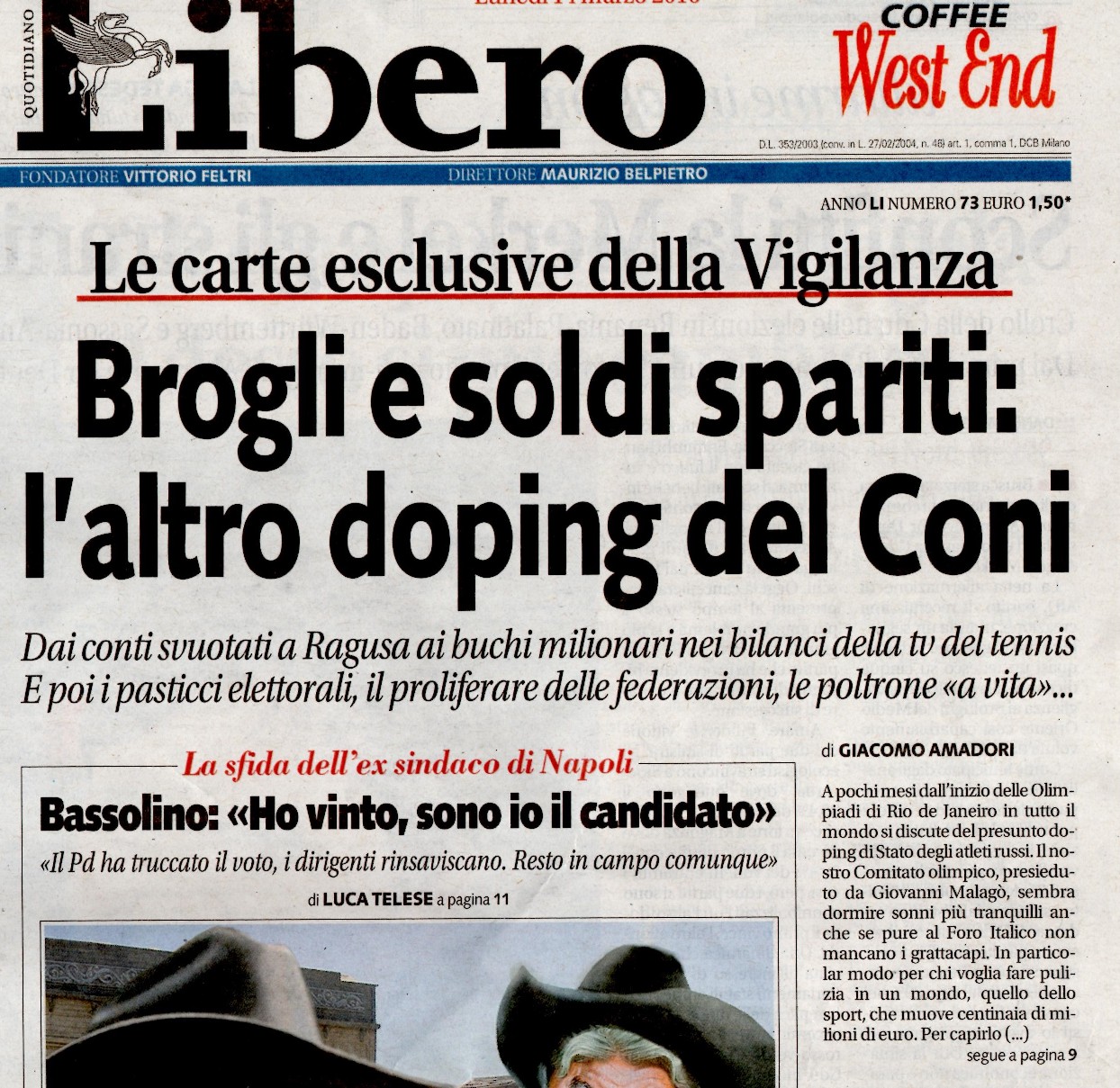 Nella prima pagina di Libero di lunedì 14 marzo campeggia il titolo “Brogli e soldi spariti: l’altro doping del Coni” – “Dai conti svuotati a Ragusa ai buchi milionari nei bilanci della Tv del tennis”. Ragusa torna sulla stampa nazionale per una inchiesta, pubblicata sulla pagina nove del giornale con titolo “Il responsabile di Ragusa sospeso per l’uso di carta di credito”, dove si approfondisce il “Caso Sicilia”. Nell’articolo di Giacomo Amadori, si legge “L’ultimo caso eclatante riguarda il Comitato provinciale del Coni di Ragusa. A gennaio l’Ufficio Vigilanza ha concluso le verifiche, relative al periodo 2006-2015, sul conto corrente acceso dal comitato presso una banca cittadina. La relazione di Befera contiene – la segnalazione di gravi irregolarità amministrativo contabili – ed è stata inviata – alla procura della Repubblica presso il Tribunale di Ragusa in data 29 gennaio 2016 (poi seguita da denuncia querela dell’11 febbraio 2016) e alla Corte dei Conti (…) al fine di verificare eventuali ipotesi di condotte appropriative e distrattive -. Per questo è stato sospeso dal suo incarico il responsabile del Coni di Ragusa Rosario Cintolo. Un nome non insignificante nel panorama politico siciliano. Infatti è stato capogruppo di una lista che sosteneva l’ex sindaco Pdl Nello Dipasquale, passato dalla Dc al Cdu, a Forza Italia e infine, nel 2014, al Pd che oggi Dipasquale rappresenta all’Ars. Cintolo, a margine dell’audizione in cui gli sono state contestate le accuse, ha difeso il proprio buon nome e non ha nascosto gli stretti rapporti con la politica e con il sottosegretario Davide Faraone. Quest’ultimo, secondo una fonte di Libero, avrebbe personalmente contattato i vertici del Coni per chiedere chiarimenti sull’indagine in corso. Cintolo aveva aperto un conto dieci anni fa e in audizione ha dichiarato che – non ritenne di comunicarne l’esistenza (…) anche in considerazione del fatto che tutte le somme venivano spese al fine della gestione della Scuola regionale dello Sport -. Sul conto tra il 2006 e il 2012 sarebbero entrati 837 mila euro della Regione e ne sarebbero usciti 792 mila in assegni, di cui 5 circolari; 628 milioni erano intestati al Comitato provinciale ragusano, a Cintolo, al segretario e alla Scuola. 37 mila sono stati invece prelevati in contanti. Nel 2012, quando il Coni ha disposto la chiusura di tutti i conti correnti dei comitati locali, quello di Ragusa è rimasto aperto. A fine febbraio il responsabile della Vigilanza ha smontato la difesa di Cintolo: -Ha reperito e fornito un insieme destrutturato di documenti (contratti, fatture …) incompleto (…) che non è oggettivamente relazionabile ai movimenti in uscita dal conto in esame (se non in minima parte) – e – non risulta identificabile, sulla base della documentazione fornita, la finalità istituzionale della spesa e non risulta rintracciabile l’utilizzo del denaro che ne è seguito -. Con queste carte in mano Befera ha denunciato Cintolo in procura. Senza preoccuparsi dei suoi amici”.