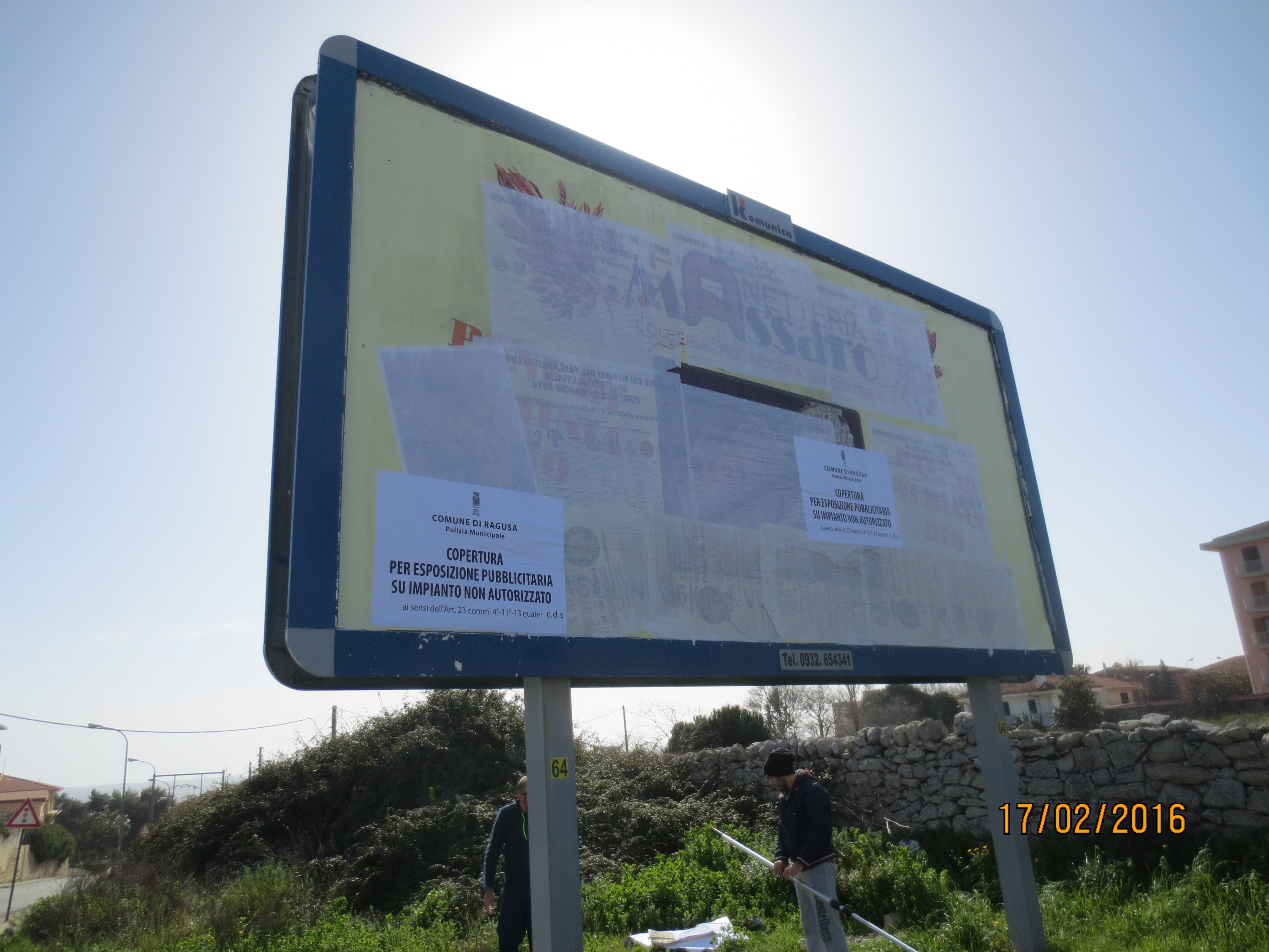 La Polizia Municipale di Ragusa ha provveduto alla copertura di undici impianti pubblicitari 6×3 ubicati in Viale Europa, via A.Fanfani, via A.Moro, via E. Fieramosca, via Mongibello, slargo via Forlanini e via Plebiscito. Le ditte che hanno installato detti impianti, a seguito di accertamenti presso gli uffici tecnici competenti, sono risultate infatti sprovviste di autorizzazione e quindi sanzionate secondo le norme del codice della strada. Essendo tali strutture installate su suolo pubblico, sono tutti suscettibili di rimozione forzata da parte della Pubblica amministrazione che porrà in essere tale provvedimento, con spese a carico delle ditte proprietarie, nel caso in cui i proprietari non provvedano direttamente. “Gli interventi posti in essere dall’apposita unità operativa in forza al Comando di P.M. – dichiara il Vice sindaco con delega alla Polizia Municipale, Massimo Iannucci – mirano al rispetto della normativa in materia di pubblicità e decoro urbano. Per questo motivo gli uffici competenti continueranno le operazioni di controllo su tutti gli impianti pubblicitari presenti nel territorio”.