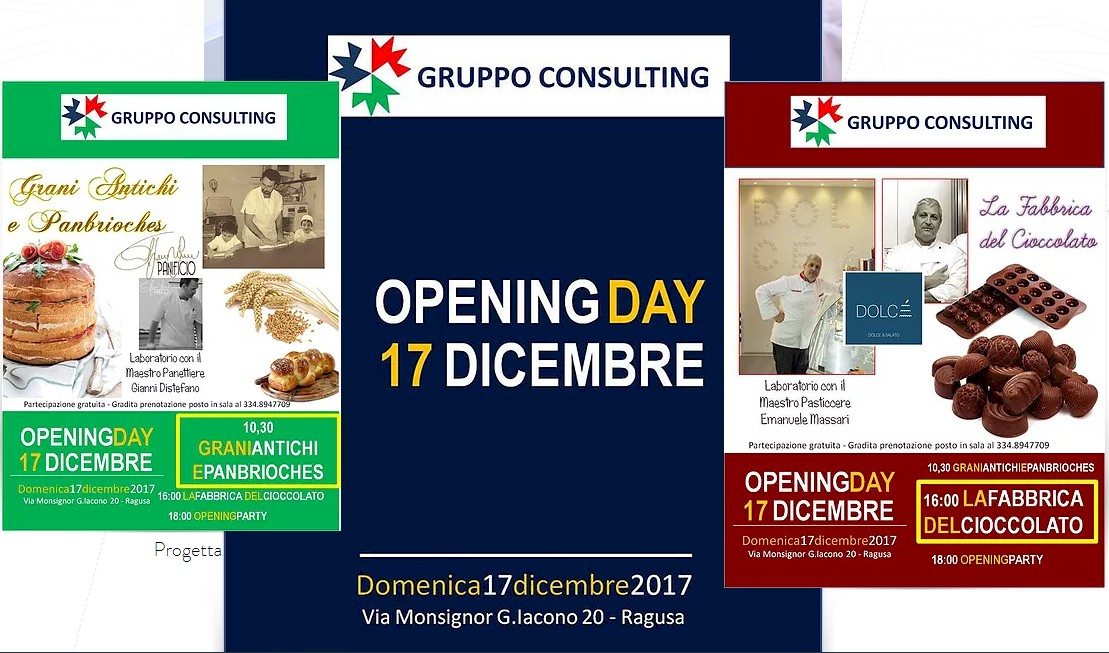 Domenica 17 dicembre si festeggia l’inaugurazione della nuova sede del Gruppo Consulting in via Monsignor Iacono n. 20 a Ragusa. Alle ore 10,30 è previsto un laboratorio con dimostrazioni pratiche “Grani antichi e panbrioches”: il Maestro Panettiere Gianni Distefano guiderà il pubblico tra le farine di grani antichi e svelerà i segreti del panbrioche. Alle ore 16,00 laboratorio con dimostrazioni pratiche “La fabbrica del cioccolato”: il Maestro Pasticcere Emanuele Massari spiegherà come realizzare da soli a casa, in pochi semplicissimi passi, gustosi cioccolatini. Alle ore 18,00 inaugurazione e gran festa. Gli eventi sono a partecipazione gratuita e chi è interessato ad uno o ad entrambi i laboratori può prenotare il posto in sala telefonando al numero 334.8947709.