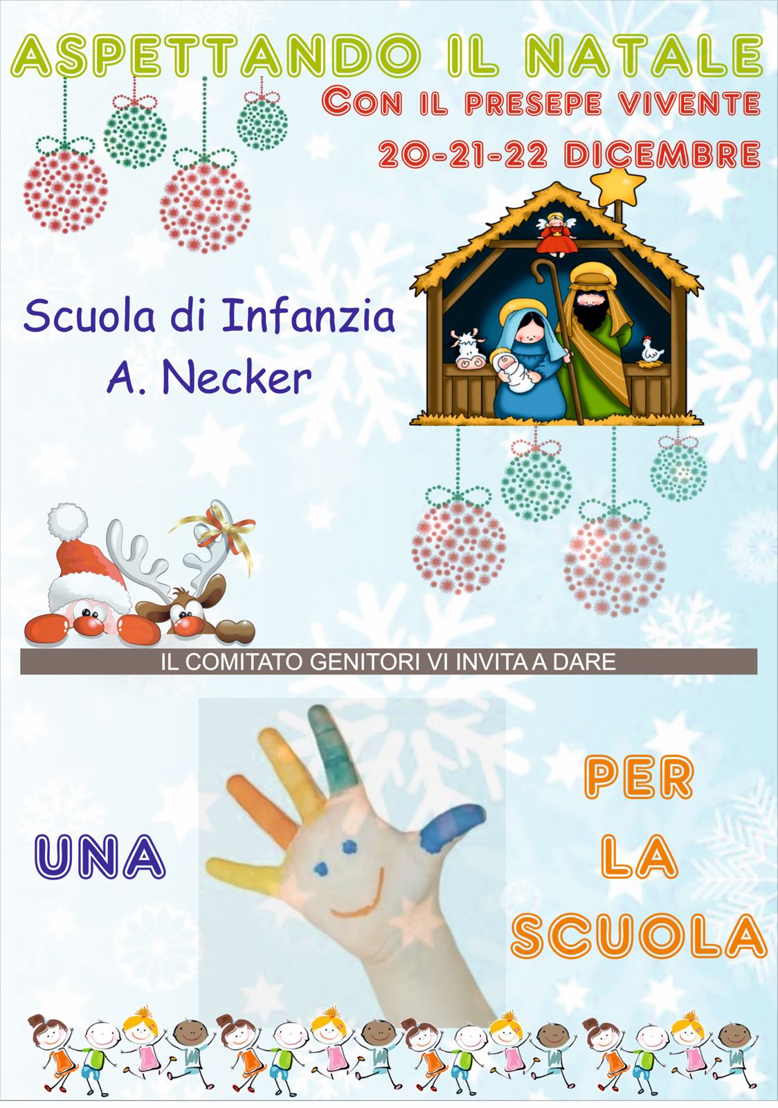 La scuola dell’infanzia Albertine Adrienne Necker, di Via Teocrito a Ragusa, svolgerà un suo presepe vivente il 20, 21 e 22 dicembre. Mercoledì 20 alle ore 10 ci sarà l’inaugurazione alla presenza degli amministratori locali. Il presepe vivente della Necker potrà essere visitato mercoledì 20 venerdì 22 dalle 10 alle 11,30 e giovedì 21 dicembre dalle 16,30 alle 18.