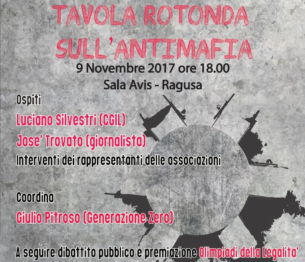 Giovedì 9 novembre alle ore 18:00, presso la sala Avis di Ragusa, si svolgerà la Tavola rotonda sull’antimafia, promossa dall’associazione Gls – Giovani Legalità Sport in partnership con Generazione Zero, la Fuci di Ragusa e di Vittoria e in collaborazione con Libera e Cgil. Con la conferenza di giovedì si conclude il percorso tracciato dal progetto Legaliblei, legato al bando “Giovani protagonisti di sé e del territorio (CreAzioni Giovani)” del Dipartimento del lavoro, della famiglia e delle politiche sociali della Regione Siciliana. Insieme a José Trovato, giornalista ennese, autore di “Mafia Balorda”, e Luciano Silvestri, Responsabile Legalità della CGIL, già impegnato in Campania nel contrasto al caporalato, saranno affrontati alcuni temi fondamentali come la corruzione, le nuove disposizioni riguardanti la confisca dei beni contenute nel nuovo Codice antimafia, la partecipazione civile e il fronte europeo di prevenzione e contrasto relativamente alle nuove rotte e dinamiche delle mafie, i cui interessi sono sempre più internazionali. Dopo aver discusso con gli ospiti verrà presentato l’ebook scritto dai ragazzi che hanno partecipato al corso sulla “Storia dell’infiltrazione mafiosa in provincia di Ragusa” e saranno premiati i vincitori delle Olimpiadi della Legalità che si sono svolte l’8 ottobre scorso. La manifestazione sportiva ha visto l’affermazione della squadra Biscari (S.p.r.a.r. della Fondazione San Giovanni Battista) nel calcio a 5 e della squadra Le Papere (ragazzi under 19) nella pallavolo.
