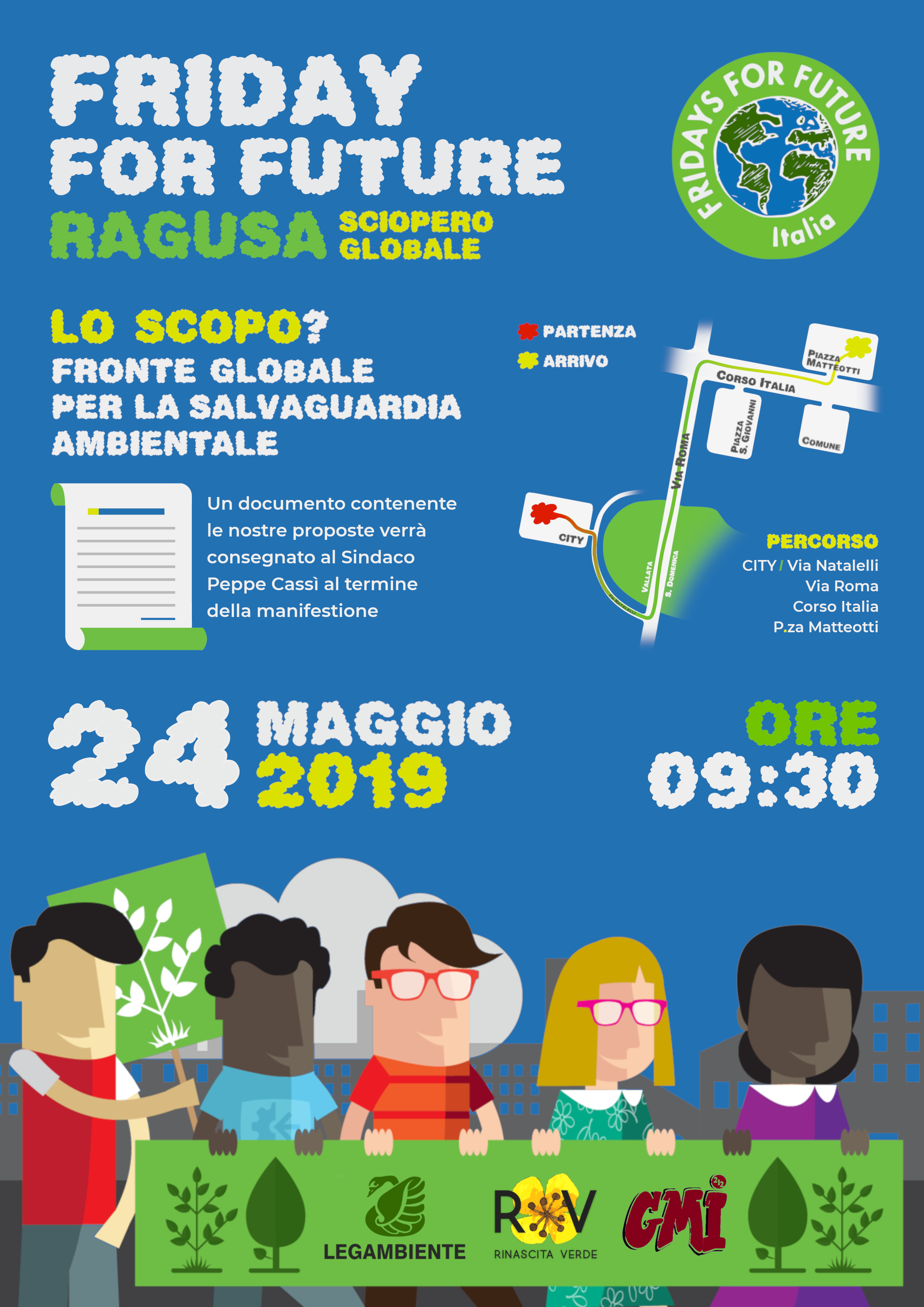 Dopo il primo sciopero del 15 marzo anche in città un corteo attraverserà il centro storico, per dichiarare guerra al riscaldamento globale: venerdì 24 maggio gli studenti di Ragusa insieme agli attivisti di Rinascita Verde e Giovani Menti Indipendenti si raduneranno di fronte al City. Da lì partirà un corteo che terminerà davanti al comune in piazza Poste. Dopo una breve serie di interventi, che avranno lo scopo di far comprendere il significato della manifestazione, una delegazione di studenti si incontrerà con il sindaco al quale verrà consegnato un documento contenente la richiesta di dichiarazione di emergenza climatica e alcune proposte, a rilevanza locale, per contribuire alla risoluzione del problema. Alla manifestazione aderisce anche Legambiente.