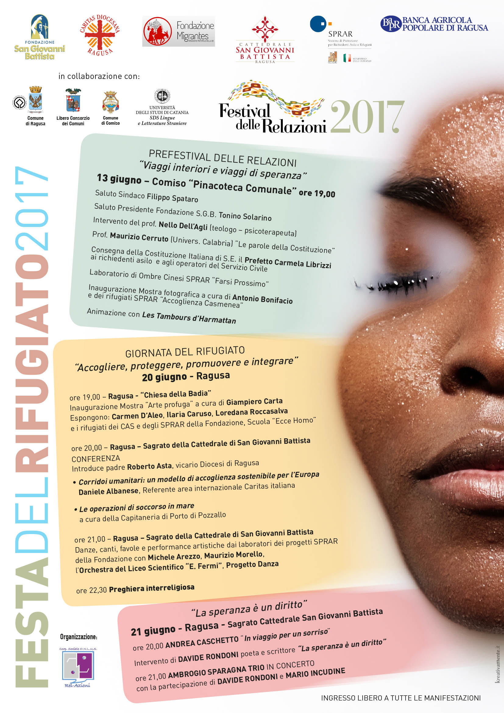Accogliere, proteggere, promuovere ed integrare questi i verbi sul quale papa Francesco ha invitato a riflettere i cristiani in relazione al fenomeno delle migrazioni. Queste le direttive lungo le quali il Festival delle Relazioni muoverà i suoi passi nella sua terza edizione. Primo appuntamento alle 18:30 del 13 giugno alla Pinacoteca comunale di Comiso per “Viaggi interiori e viaggi di speranza” con l’inaugurazione della mostra fotografica a cura di Antonio Bonifacio. Nel corso del pomeriggio sono previsti gli interventi del professor Nello Dell’Agli, del professor Maurizio Cerruto e la consegna della Costituzione Italiana di S.E. il Prefetto Carmela Librizzi ai richiedenti asilo e agli operatori del Servizio Civile nazionale. Il 20 giugno si celebrerà a Ragusa la Giornata del Rifugiato. Primo appuntamento alle ore 19:00 nella Chiesa della Badia con l’inaugurazione della mostra “Arte profuga” a cura di Giampiero Carta. Espongono la stilista di moda Loredana Roccasalva, Carmen D’Aleo, Ilaria Caruso. Verranno esposte le opere e le creazioni degli ospiti dei centri di accoglienza di “Borgo Tresauro” e dei progetti Sprar gestiti dalla Fondazione San Giovanni Battista. Uno spazio sarà riservato ai mandala creati dagli studenti della scuola Ecce Homo in collaborazione con i richiedenti e titolari di protezione internazionale. Alle ore 20:00, sul sagrato di piazza San Giovanni, si terrà la conferenza “Rifugiati: accogliere, proteggere, promuovere ed integrare”. Daniele Albanese, referente area internazionale Corridoi Umanitari di Caritas Italiana, relazionerà sul tema “Corridoi umanitari, un modello di accoglienza sostenibile per l’Europa”. E’ previsto anche l’intervento della Capitaneria di Porto di Pozzallo dal titolo “Le operazioni di soccorso in mare”. Al termine danze, canti, teatro e performance artistiche dai laboratori dei progetti SPRAR di Ragusa e Comiso a cura di Progetto Danza, Michele Arezzo, Maurizio Morello e l’Orchestra del Liceo Scientifico “Fermi” di Ragusa. Concluderà la serata un momento di preghiera interreligiosa. Giorno 21 giugno alle ore 20:00, infine, sempre sul sagrato della Cattedrale, Andrea Caschetto relazionerà sul tema “In viaggio per un sorriso”, seguirà l’intervento del poeta e filosofo Davide Rondoni. Alle ore 21:00 grande musica con Ambrogio Sparagna Trio con la partecipazione di Mario Incudine e Davide Rondoni. Il progetto è frutto della collaborazione tra la Fondazione San Giovanni Battista con il Servizio Centrale SPRAR, Caritas Diocesana di Ragusa, Fondazione Migrantes, Cattedrale San Giovanni Battista e la cooperativa Rel-Azioni.