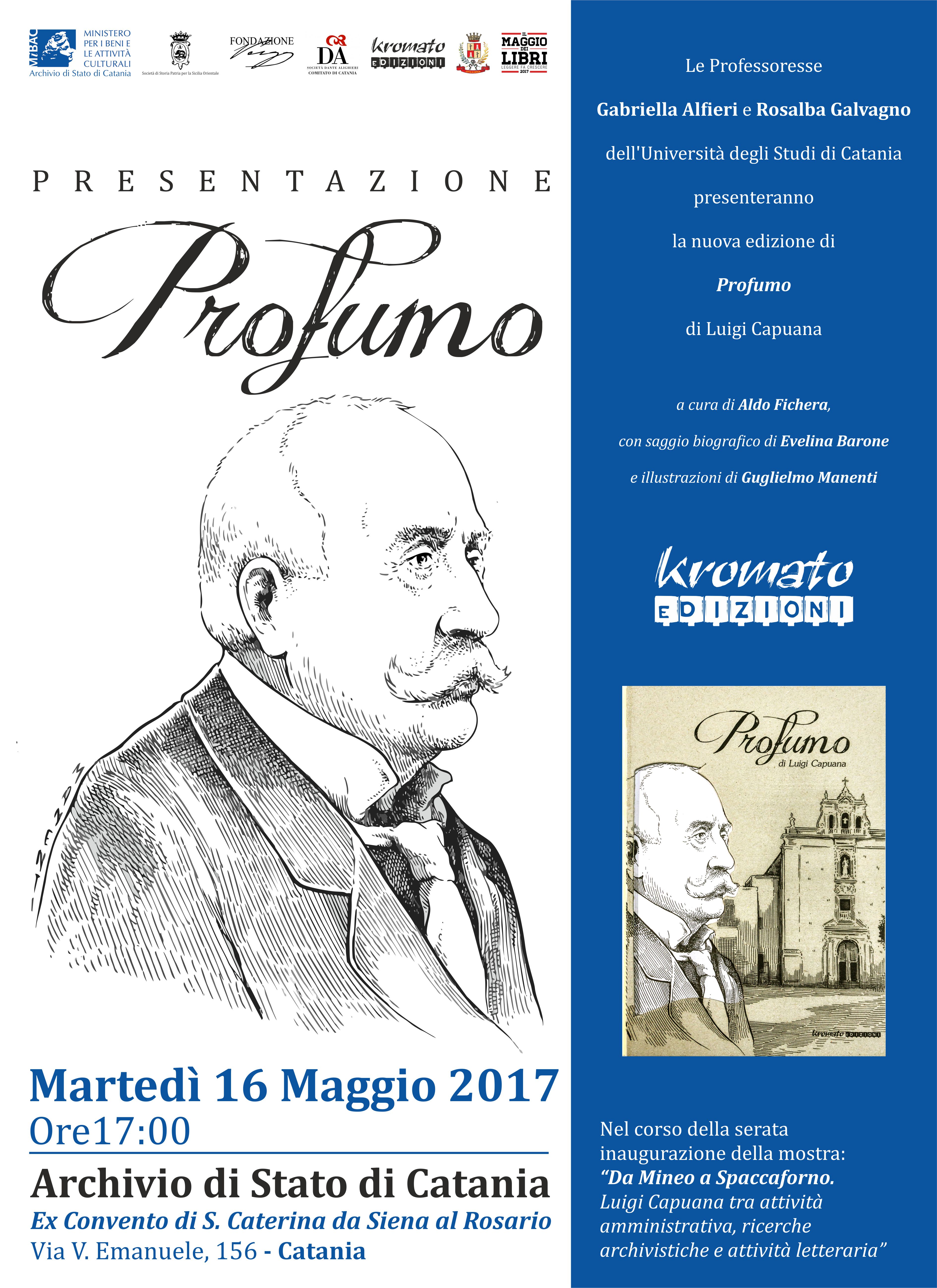 L’Archivio di Stato di Catania ospiterà dal 16 Maggio al 30 Giugno 2017 una mostra interamente dedicata ai rapporti intercorsi tra Capuana e la cittadina di Spaccaforno, oggi Ispica. La mostra dal titolo “Da Mineo a Spaccaforno. Luigi Capuana tra attività amministrativa, ricerche archivistiche e attività letteraria”, verrà inaugurata martedì 16 Maggio alle 17:00. Seguirà la presentazione della nuova edizione di “Profumo” di Luigi Capuana, edita dalla Kromato Edizioni di Ispica, a cura delle Professoresse Gabriella Alfieri e Rosalba Galvagno dell’Università degli Studi di Catania. Saranno presenti: Aldo Fichera, curatore, Evelina Barone, autrice del saggio biografico e Guglielmo Manenti, illustratore. La mostra comprenderà le illustrazioni realizzate da Guglielmo Manenti per la nuova edizione, le lettere di Capuana di proprietà della Biblioteca Comunale di Ispica, scatti fotografici dei luoghi di Spaccaforno descritti nella Novella “Iela”, antiche stampe, documenti e lettere di Capuana messe a disposizione dall’Archivio di Stato di Catania, dalla Fondazione Verga, dalla Società di Storia Patria per la Sicilia Orientale.