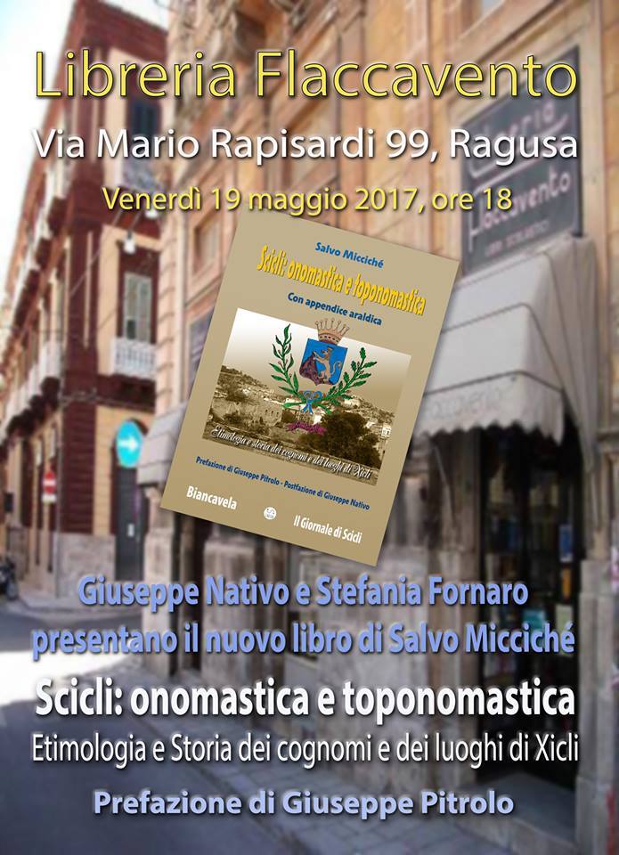 Venerdì 19 maggio 2017, alle ore 18, presso la Libreria Flaccavento di Via Rapisardi 99, difronte Posta, a Ragusa si terrà la presentazione del libro di Salvo Micciché “Scicli: onomastica e toponomastica”. Stefania Fornaro e Giuseppe Nativo dialogheranno con l’autore. Nel libro sono inseriti contributi di Ignazio La China, Stefania Fornaro, Elio Militello, Paolo Militello, Pietro Militello, Giuseppe Nativo, Paolo Nifosì, Giuseppe Pitrolo. Completano l’opera i “Medaglioni” di Guglielmo Pitrolo. Alcuni stemmi araldici sono stati disegnati dagli alunni del prof. Carmelo Errera.