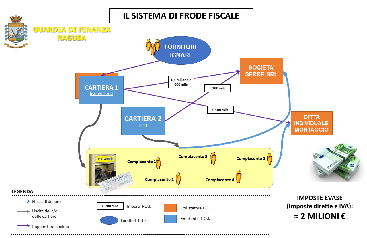A Vittoria i finanzieri del Comando Provinciale di Ragusa hanno denunciato 9 persone responsabili a vario titolo di 4 aziende, per reati fiscali e sequestrato beni immobili, mobili nonché somme di denaro intestati agli indagati per oltre 600 mila euro. Si tratta di aziende che si occupano di montaggio di serre, una delle attività economiche cardine del vittoriese. A seguito di mirati accertamenti, iniziati già nel 2015, i finanzieri sono riusciti a scoprire un sistema di frode complesso e ben congeniato, basato sull’emissione ed utilizzo di fatture per operazioni inesistenti quantificate in oltre un milione di euro, poste in essere da 4 aziende serventi l’una a favore dell’altra. Le operazioni commerciali indicate nelle fatture, tra l’altro di rilevante importo, non erano mai avvenute (venivano utilizzati timbri falsi, apposte firme apocrife, indicate cessioni di beni non commercializzati dai fornitori, ecc.) e i pagamenti erano tutti simulati.
